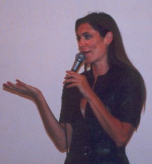 Before Alex Tydings came on we had a new Aphrodite video to Bananarama's 'Venus'. Alex clearly enjoyed it, and came bouncing onstage in a mini kilt and bunches. She was the most energetic and pumped up of all the guest, and her talk just flew by. First she rang her mum on her cell phone and we all had to yell hello. She then spoke for a long time about the show she and Claudia Christian are developing that sounds like a cross between Time Tunnel, Quantum Leap and Relic Hunter. Called 'Hourglass', its a fantasy adventure where she and Claudia play two scientists who travel in time to significant moments in history. She also spoke about filming Claudia's Taboo video. From what I understand, it's Claudia singing, and the video was directed by Claire Stansfield. Alex was persuaded to do some Irish dancing - something she wouldn't do in England in May! - and spoke a little about how she was really looking forward to doing the XENA musical episode Last Dance that was shelved after clearance problems over the songs. Alex loves dancing, and was disappointed, although we all agreed Many Happy Returns was fun too.