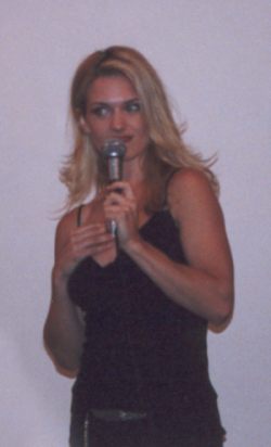 The guests for Saturday were Vicky Pratt and Claire Stansfield. First up was Vicky, and she was very relaxed and friendly. She wasn't asked that many questions about XENA, and she spoke more about her new show 'Mutant X', which is being filmed in Vancouver and is an X Men TV show. She did her own trivia quiz at the beginning, giving out signed pictures as prizes, although they were a bit heavy on the Cleo content for most of us!