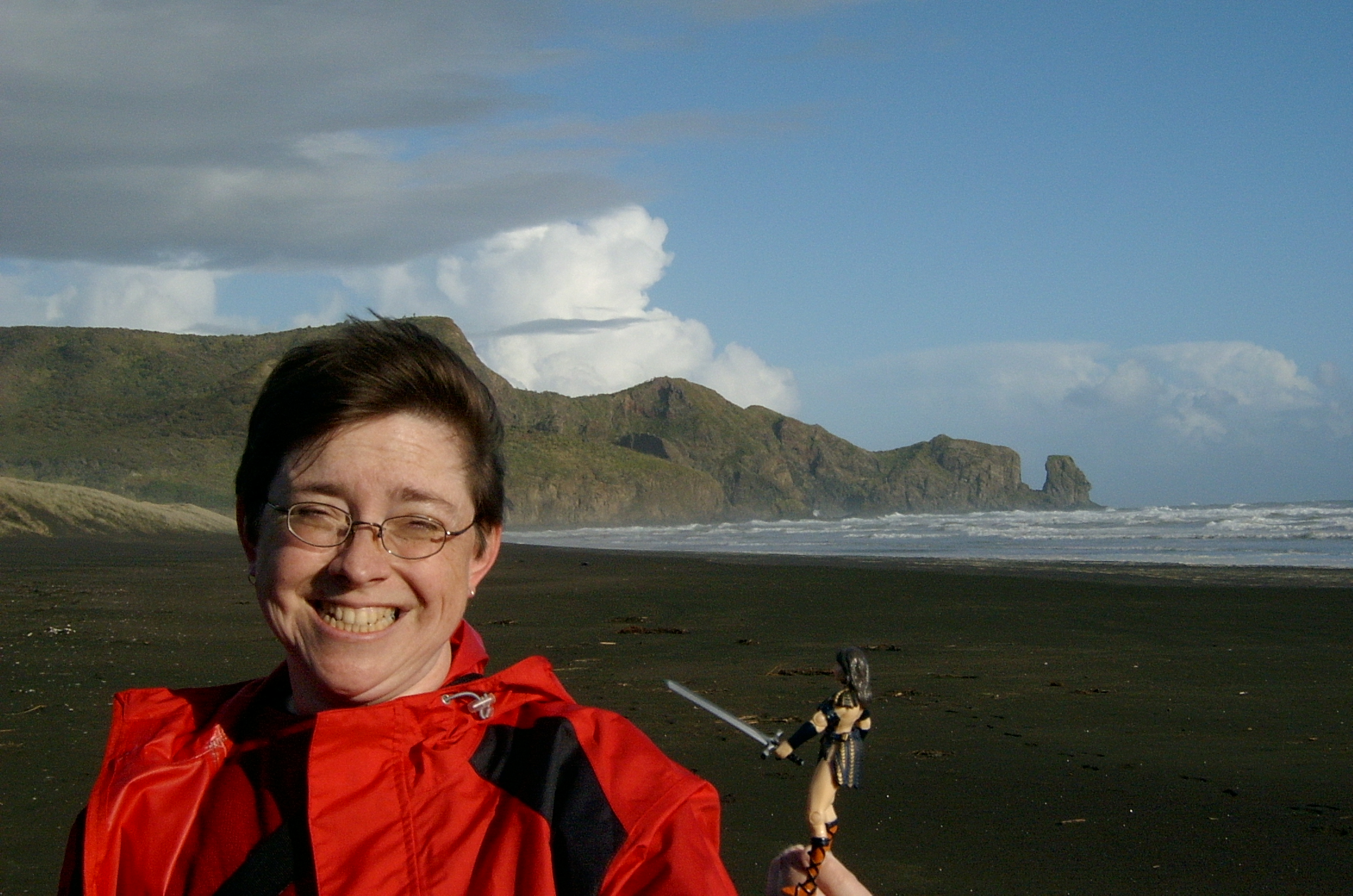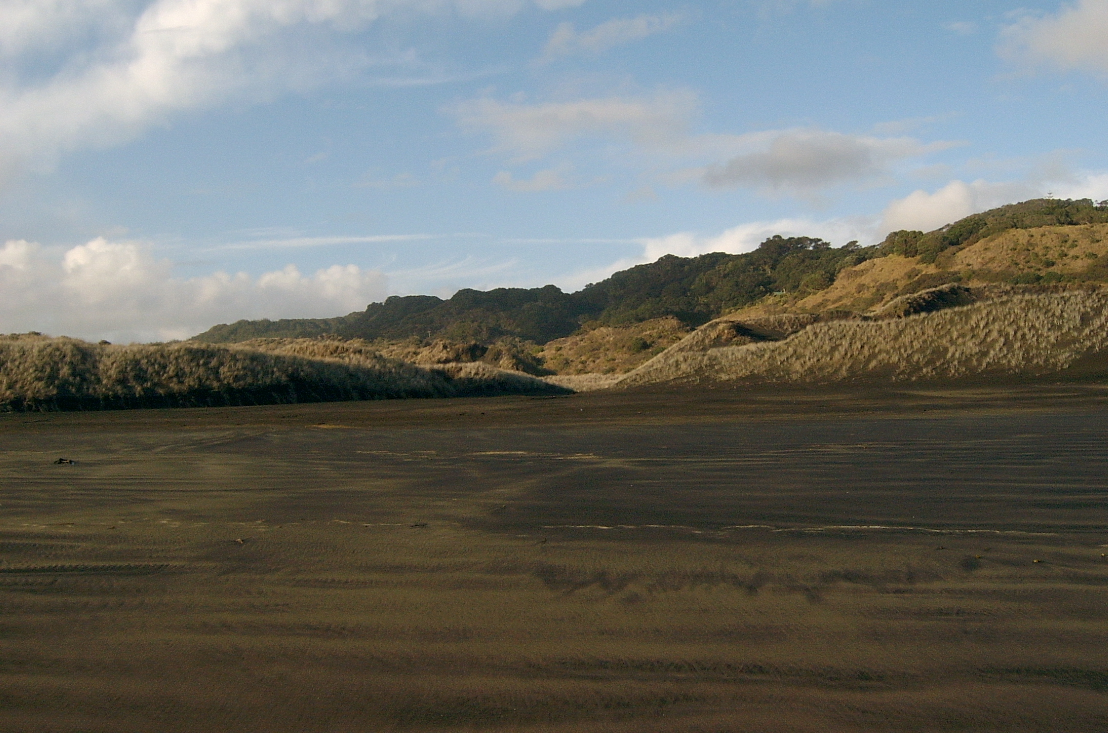 Anyway, back to the car park and head on down to Bethells Beach. It was used many many times in the show, but is really just a very pretty beach with weird dark sand. Callisto's can be seen in the distance and you can roll in the surf like at the end of The Bitter Suite!
